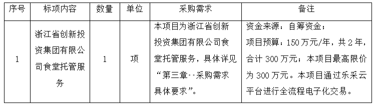 一、招標(biāo)項(xiàng)目名稱:浙江省創(chuàng)新投資集團(tuán)有限公司食堂托管服務(wù)項(xiàng)目